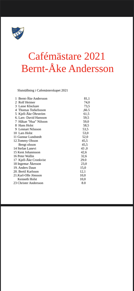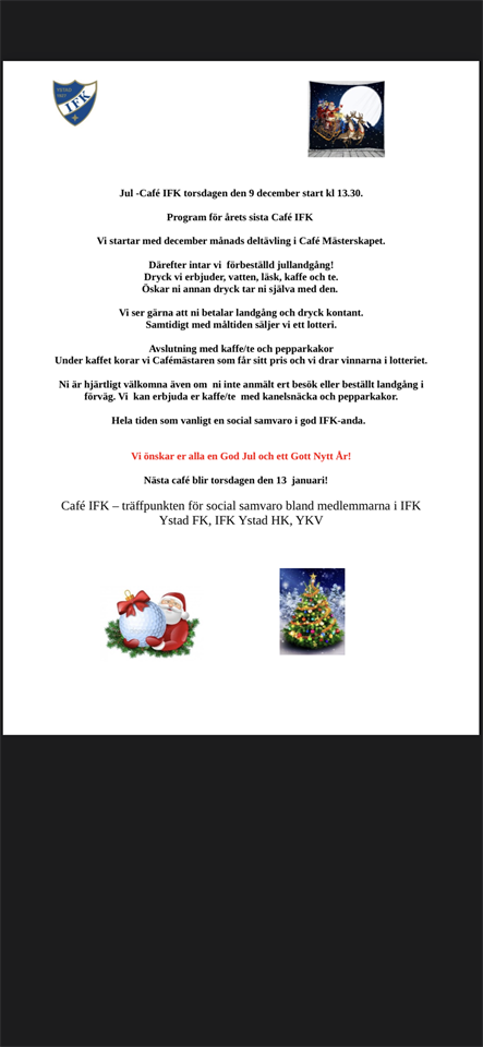 "Info från Café IFK den 9 december. Dagens café inleddes med att vi tände ljus och höll en tyst minut för Leif Persson som lämnat oss veckan innan. ”Lille Leif” som han kallades för kom från Öja FF 1967 och blev en av de ledande spelarna i IFK:s lag under 60 o 70 talet som då spelade i div 3 och div 2 (den näst högsta serien efter Allsvenskan. Efter hans aktiva tid har han alltid på ett eller annat sätt stöttat och hjälpt föreningen. Därefter var det dags för årets sista deltävling i Cafe mästerskapet. Peter Wallin hade en frågetävling över 21 frågor i blandade ämnen. Flest rätt hade Rolf Heimer med 11 rätt före Bengt Olsson och Håkan ”Hua” Nilsson båda på 10 rätt. Bernt-Åke Andersson kom på 4:e plats och höll därmed undan i toppen och blev Cafémästare 2021. Till denna sammankomst frångick vi det vanliga kaffe o kakor och intog en jul-landgång med tanke på kommande helger.Kaffe och pepparkakor avslutade caféet. Under kaffet hyllade vi Cafe mästaren som fick ta emot pokalen som bevis på Café Mästare 2021 plus en chokladask. Vi drog också vinnarna i ett lotteri som vi sålde denna dag Nästa år blir första Café IFK torsdagen den 13 januari med start kl 13,30 Vi får då besök av Peter Fausö ordförande och Andreas Lindén kassör från fotbollen, som skall berätta om den kommande arbetet inom fotbollen. Nya som gamla besökare är hjärtligt välkomna till vårt café. Til sist ber vi att få önska er En God Jul och ett Gott Nytt År Rolf o Klockare Café IFK – träffpunkten för social samvaro bland medlemmarna i IFK Ystad FK, IFK Ystad HK, YKV"