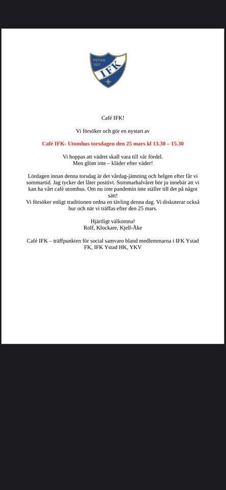 Så har vi lagt 2020 bakom oss och välkomnar 2021 som på många sätt bara kan bli bättre än året vi lämnar. Coronaviruset och covid-19 har påverkat oss alla och hela samhället. För föreningens vidkommande har detta märkts inte minst för a-laget där det bara blev en halv säsong och med begränsat publikantal och inställda träningar. Även för våra ungdomar och ledare har påverkan varit kännbar med inställda matcher till följd av sjukdomssymptom o s v. Vi har inte heller kunnat påbörja arbetet med kiosk- och förrådstillbyggnaden som var tänkt då några anläggningsbidrag inte utgått och vi, trots många ideella krafter, har för avsikt att bekosta denna tillbyggnad med bidrag och ideella insatser. Men vissa renoveringar gjordes av vår ”villagrupp” som bl a har bytt fönster och annat smått och gott i villan. Men låt oss fokusera på det som var positivt under 2020. IFK har inte på väldigt länge haft fler medlemmar än vi har idag. Vi har lag i de flesta åldersklasserna och om inte alltför länge vårt första juniorlag i antågande då våra 05-or börjar komma upp i ålder. Vi har en väldigt stabil och stark ekonomi och våra sponsorer har stannat kvar hos oss vilket vi är väldigt tacksamma för och som möjliggör vår ungdomsverksamhet till stor del. Vi fick se många ”röa hjärtan” när vi bad om hjälp till följd av uteblivna publikintäkter som köpte ”lotteri-biljetter”, dekaler m m. Dessutom kvalade vårt a-lag för första gången på väldigt länge till division 4. Det bar inte hela vägen och sortin blev något snöplig utifrån vår serieledning inför sista matchen men den potential som finns i laget bådar gott. Dessutom har alla spelare valt att stanna kvar, även där riktigt röa hjärtan, och vi har förstärkt laget med många bra nyförvärv som vi såklart hälsar välkomna till ”di röe”. Vår ungdomsverksamhet går bra och det är tack vare alla väldigt duktiga och engagerade ledare vi har här som lägger tid och arbete på det viktigaste vi har, barnen. Vad har vi då att se fram emot detta året? 2021 får vi hoppas blir, i sinom tid, ett normalt år i takt med att vaccinationerna kommer igång. IFK-dagen ska förhoppningsvis kunna genomföras i år och vi ska fortsätta satsningarna på ungdomarna med cupspel, läger för de som planerar detta och utbildningsmöjligheter för våra ledare. Vi har ett a-lag som fokuserar fullt ut på att detta året ta steget upp i fyran. Vi kan möjligen komma igång med tillbyggnaden av villan om samhällsläget förändras till det bättre så vi kan återgå till någon form av normalitet. Jag och styrelsen vill rikta ett stort tack till alla som hjälper till på olika sätt och gör föreningen till det den är. Alla våra ledare, Tommy och ”villagruppen” som håller ordning och fixar i villan, våra ungdomar som väljer att träna och spela med oss, Rolf som ser till så vi har det vi behöver för vår kioskverksamhet och alla som hjälper till frivilligt under matcher och arrangemang, samt våra sponsorer som bidrar till verksamheten. Stort TACK till ALLA som hjälpt till under året. Som vanligt vill vi gärna bli ännu fler som engagerar oss i föreningen. Har du lust och möjlighet så tveka inte att kontakta någon i styrelsen om du är intresserad. Vill du vara med och planera våra arrangemang så kontakta Anders Sundelius på 072-069 54 39. Vill du engagera dig i vår ungdomsverksamhet så kontaktar du Andreas Lindén på 070-597 73 37 eller Mathias Hansson på 070-866 56 57. Vill du bidra under a-lagsmatcherna kontaktar du Tobias Tell på 070-450 79 40 eller om du vill engagera dig i kioskverksamheten så kontaktar du Rolf Heimer på 072-887 23 99. Vill du jobba med våra sponsorer så hör av dig till Cecilia Wahlfridsson-Hansson på 073-386 10 92. Väl mött 2021, vi ser fram emot att ses under året och än en gång TACK för ditt stöd! Kamrathälsningar Peter Fausö Ordförande IFK Ystad FK