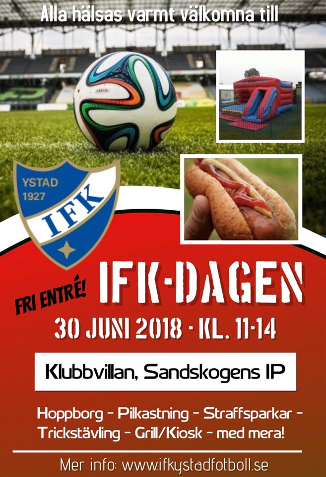 IFK-DAGEN! Lördagen den 30 juni hälsar IFK Ystads FK alla välkomna till Sandskogens IP. Mellan klockan 11-14 kommer det finnas aktiviteter för alla åldrar. Låt ditt barn leka i hoppborgen, slå straffar på våra A-lagsmålvakter, kasta pil eller bara njut av något gott att äta. Grillen och kiosken kommer vara öppna hela dagen! Detta är ett utmärkt tillfälle att träffa andra IFK:are och att avsluta vårsäsongen på! Varmt välkomna!