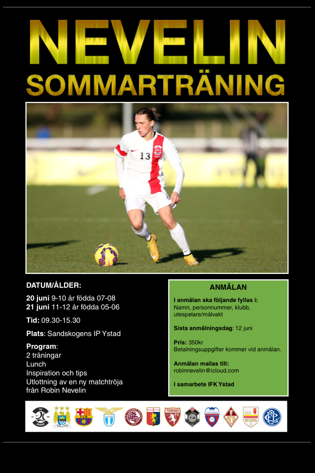 Vi har i år glädjen att samarbeta med Robin Nevelin som presenterar Nevelin Sommarträning. DATUM/ÅLDER: 20 Juni 9-10 år födda 07-08 21 Juni 11-12 år födda 05-06 Tid: 09.30-15.30 Plats: Sandskogens IP Ystad Program: 2 träningar Lunch Inspiration och tips Utlottning av en ny match tröja från Robin Nevelin ANMÄLAN I anmälan ska följande fyllas i: Namn, personnummer, klubb, utespelare/målvakt Sista anmälningsdag: 12 Juni Pris: 350kr Betalningsuppgifter kommer vid anmälan Anmälan mailas till: robinnevelin@icloud.com